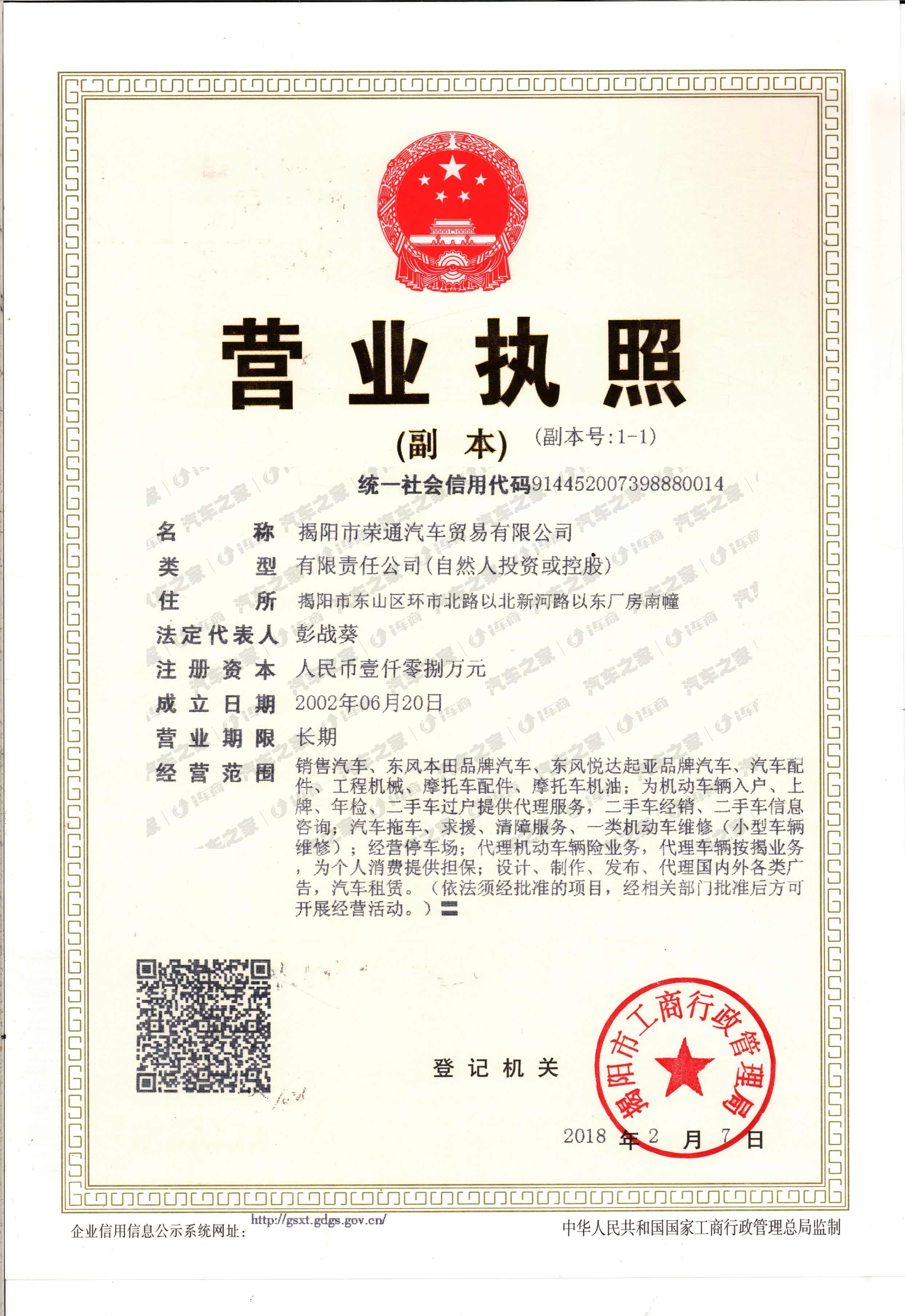 揭阳市荣通汽车贸易有限公司是一家集整车销售、售后服务、配件供应、信息反馈的“四位一体”服务企业,具有小轿车经营权、市一类维修企业,是东风本田、东风悦达起亚揭阳地区总代理,是政府公务车采购、公务车维修指定单位,也是中保财险、市交警拯救队的协作单位。公司位于市区环市路与新河路交界处,依靠其自身雄厚的实力以及完善的企业制度,构建了辐射粤东周边地区的营销网络体系,与银行、保险、经销商等联合共建了功能强大的服务平台。公司拥有一套科学有效的营销服务管理模式,全面推行先进的经营、管理理念,并拥有优雅舒适休闲的购车环境,一流的维修设备和细致周密的人性化服务。