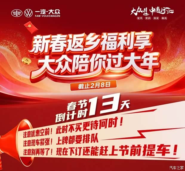 团圆不必等待,好礼无需错过。一汽-大众以满满的诚意,打造新春返乡购车盛宴,用多重豪礼致敬每一位奔波的返乡人,助力每一个家庭实现“新春开新车”的心愿。现在前往一汽-大众线下