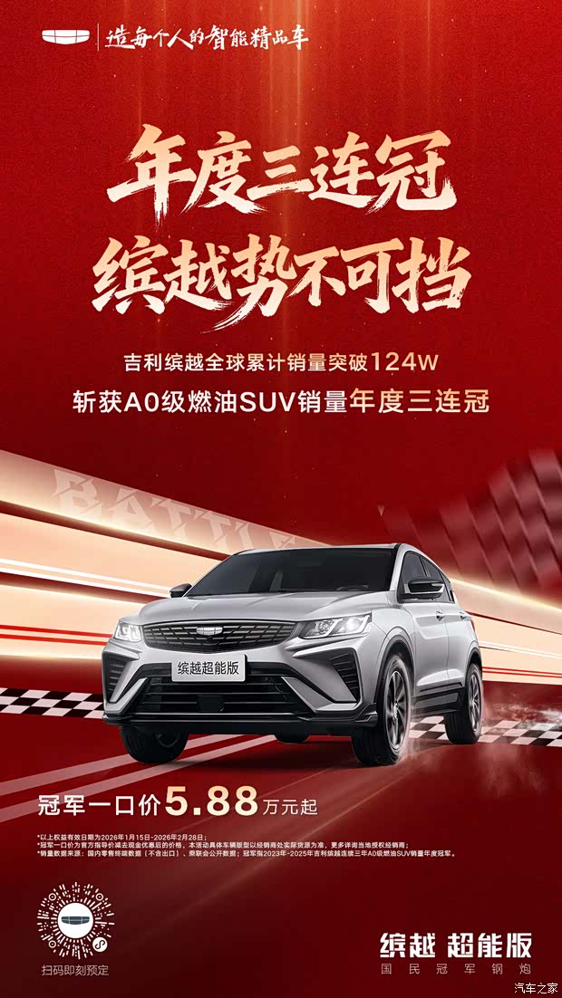 年度三连冠,缤越超能版冠军一口价5.88万元起