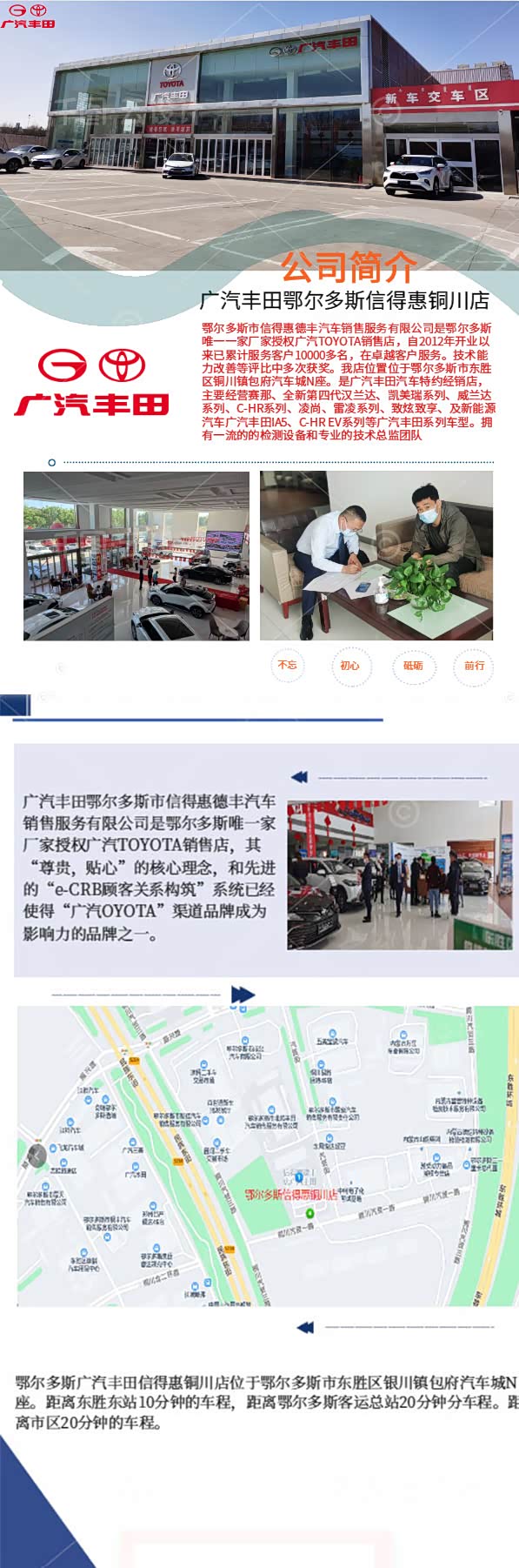 鄂尔多斯市信得惠德丰汽车销售服务有限公司是鄂尔多斯唯一一家厂家授权广汽TOYOTA销售店,其“尊贵,贴心”的核心理念,和先进的“e-CRB顾客关系构筑”系统已经使得“广汽TOYOTA”渠道品牌成为最具影响力的品牌之一。现诚邀具有自我激励和学习精神的人士加盟,以期分享我们的成功业绩并发展您的个人事业。本公司将秉承广州丰田的企业理念,为员工提供具有竞争力的薪酬待遇,并提供完备的福利待遇。公司将积极构建、完善培训体系,保证员工素质逐步提升,并努力为员工提供广阔的个人职业发展机会。