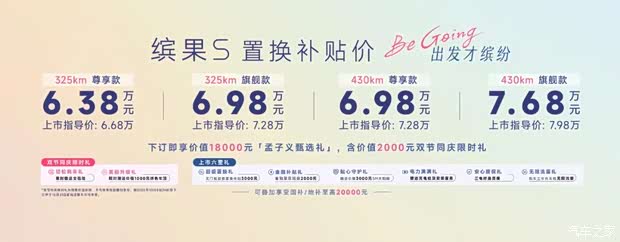 缤果S共推出325km尊享款、325km旗舰款、430km尊享款、430km旗舰款四款配置,上市指导价为6.68万-7.98万元,叠加置换政策可享置换补贴价6.38万-7.68万元,更可叠加享受至高20,000元的国家/地方购车补贴。