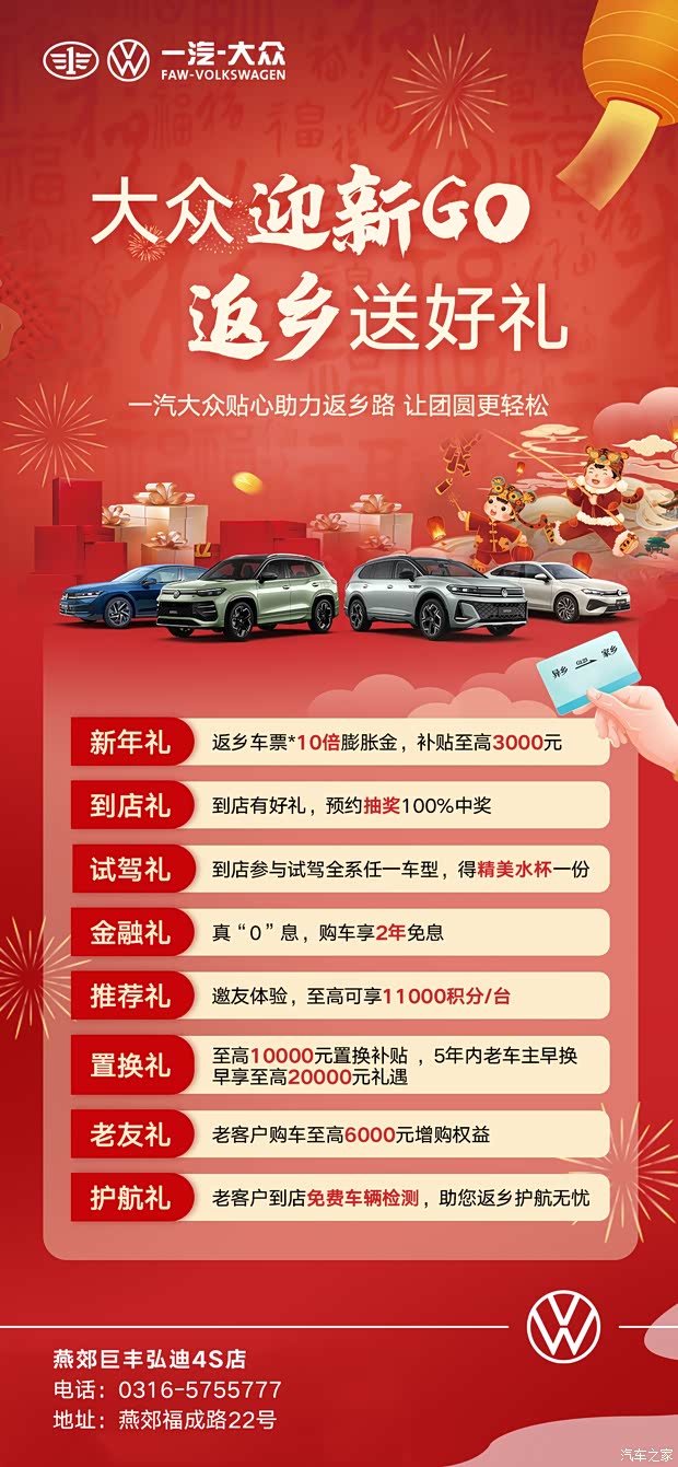 #大众迎新GO返乡送好礼 一汽-大众贴心助力返乡路,让团圆更轻松 新年礼:返乡车票*10倍膨胀金,补贴至高3000元 到店礼:到店有好礼,预约抽奖100%中奖 试驾礼:到店参与试驾全系任一车型,得精美礼品一份 金融礼:真"0"息,购车享2年免息 推荐礼:邀友体验,至高可享11000积分/台 置换礼:至高10000元置换补贴,5年内老车主早换早享至高20000元礼遇 老友礼:老客户购车至高6000元增购权益 护航礼:老客户到店免费车辆检测,助您返乡护航无忧