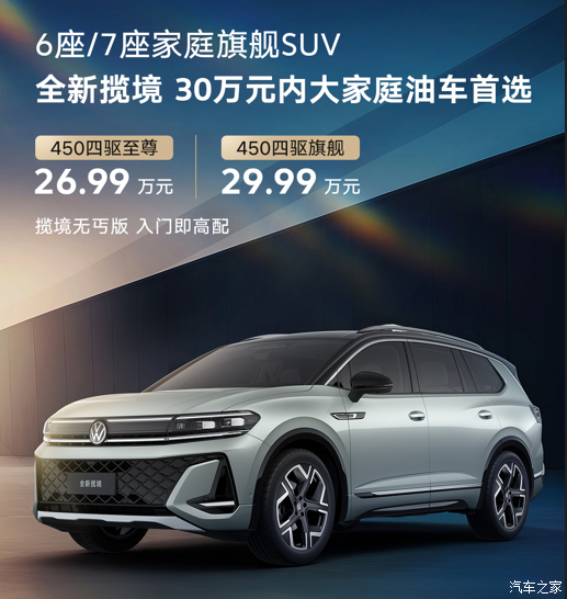 一汽-大众新款揽境正式上市,共推出4款车型,指导价格区间为26.99万-29.99万元。作为改款车型,新款揽境对外观以及内饰进行较大的调整,提供6座和7座车型,搭载全新第五代EA888 2.0T发动机。