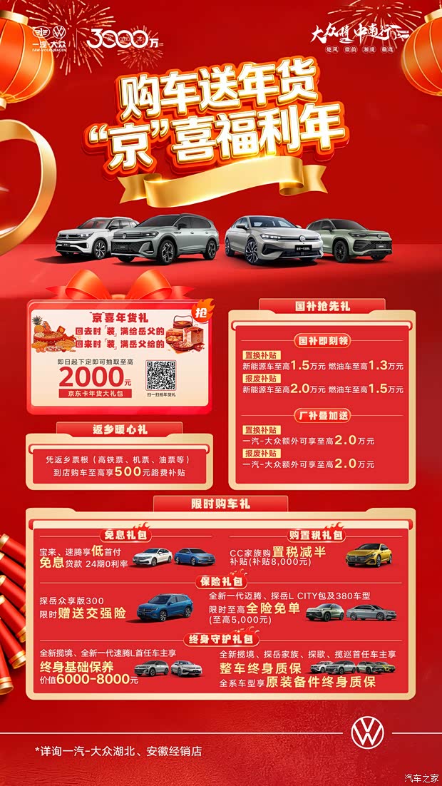 一汽 - 大众推出「购车送年货・‘京’喜福利年」专项活动,以新春购车四重礼为核心,
