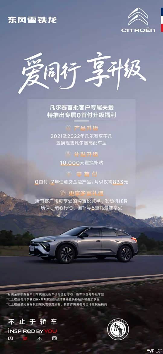 对于首次购车的朋友,东风雪铁龙准备了丰厚的见面礼;而对于一路同行的老客户,东风雪铁龙更是备好了专属的贴心回馈。对于2021年及2022年购买凡尔赛享不凡车型的首批老客户,东风雪铁龙特别推出了“爱同行·享升级”专属回馈政策。这些早期支持品牌的车主,如今迎来了升级换代的最佳时机:置换2024款凡尔赛高配车型(不含海外版),可在原有5000元置换补贴基础上,再享5000元专项补贴,叠加后置换补贴高达10000元。配合“7年任意贷”金融方案(1年免息+6年低息),不仅能实现0首付换车,月供最低仅需833元,大幅减轻月供压力。更令人安心的是,置换客户可叠加享受发动机终身质保、五年无忧等多项常规服务政策,升级新车的同时,全方位用车保障持续在线。