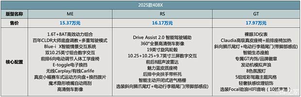 为了更好地满足消费者不断升级的用车需求,2025款408X共推出ME、RS和GT三个版型,在传承408X创新设计、精致内饰和ji致驾控的基础上,对配置进行了强化升级。