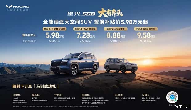 「全能硬派大空间SUV」星光560正式上市。新车共推出四款车型配置:燃油1.5T 6MT舒适型、燃油1.5T CVT精英型、插混125km豪华型、纯电500km豪华型,置换补贴价为5.98万元-9.58万元,原上市指导价为6.28万元-9.88万元。