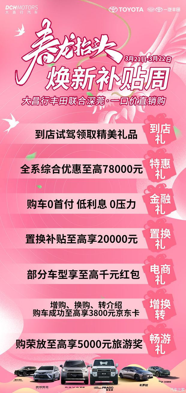 1、到店礼:到店试驾领取精美礼品; 2、特惠礼:全系特惠一步到位综合优惠至高可享7.8万元; 3、增换转:增购、换购、转介绍至高可享3800元京东卡; 4、金融礼:0首付低利息0压力; 5、置换礼:置换购车至高可享2万元补贴; 6、电商礼:至高可享千元红包; 7、畅游礼:购荣放至高可享5000元旅游大奖;