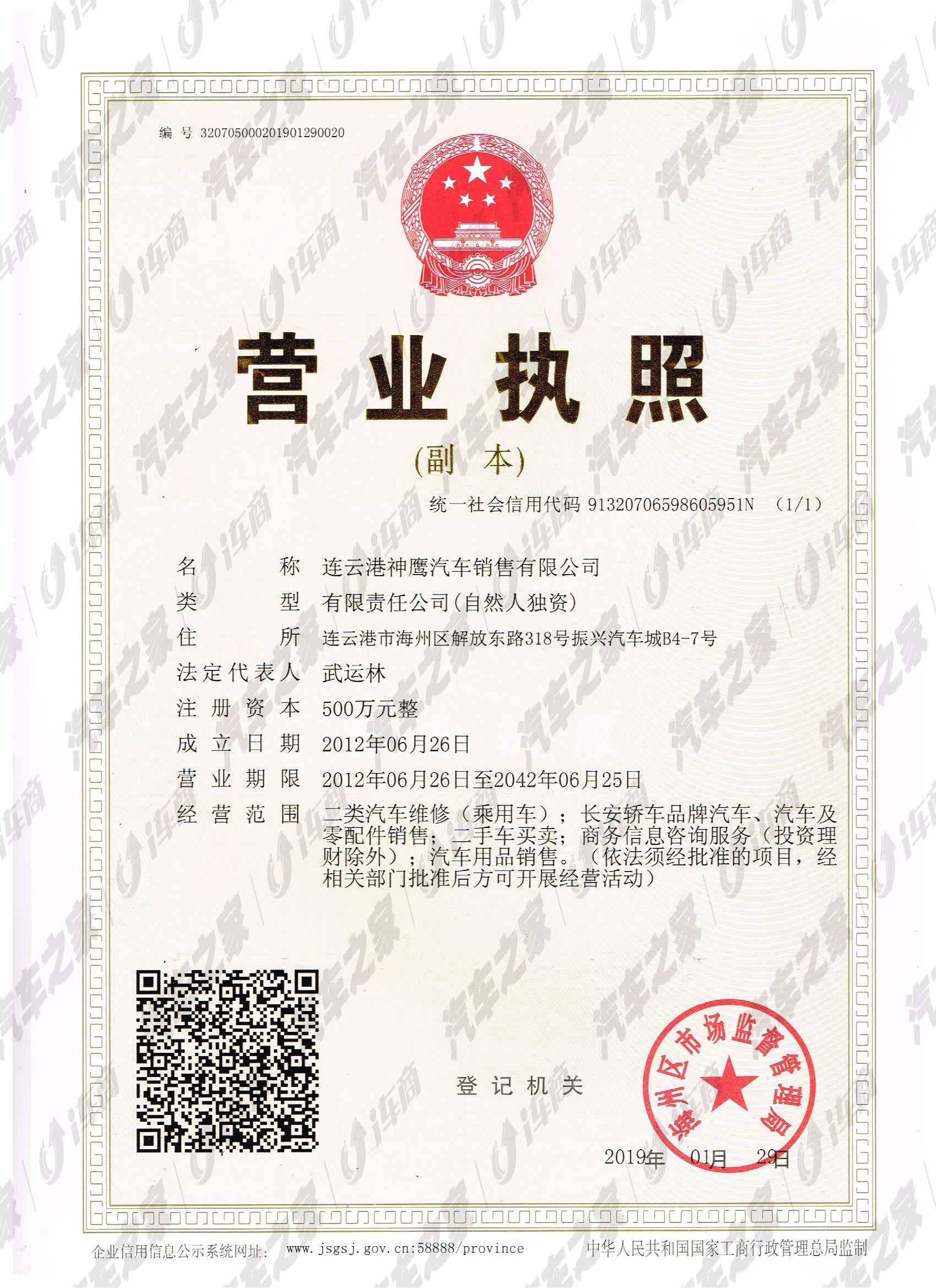 连云港神鹰汽车销售有限公司成立于2012年6月,公司在运作过程中实施品牌营销战略,成为长安汽车在连云港市的专营4S店(即:集整车销售、维修服务、备件供应及信息反馈为一体的经营模式)。