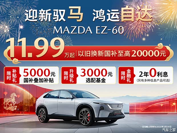 即日起至2026年2月28日,下订购买长安马自达EZ-60/运动版车型,除新国补外还可享限时三重礼!