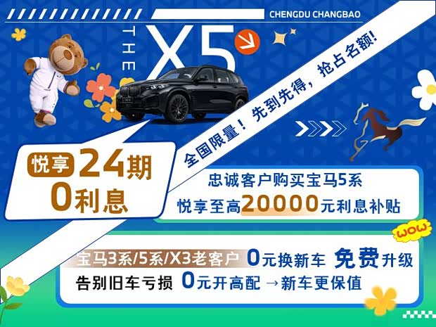 如果您对宝马X5感兴趣,不妨前往[4s]长征宝马5S店-华晨宝马店一探究竟。该店位于成都市成华区东三环路二段龙潭工业园航天路2号,您可以拨打咨询电话95013053612了解更多详情。目前,宝马X5正推出悦享24期0利息的优惠活动,优惠时间为2026年4月1日至2026年4月30日。万物春生,好事加马,快来把握这次难得的购车机会吧!
