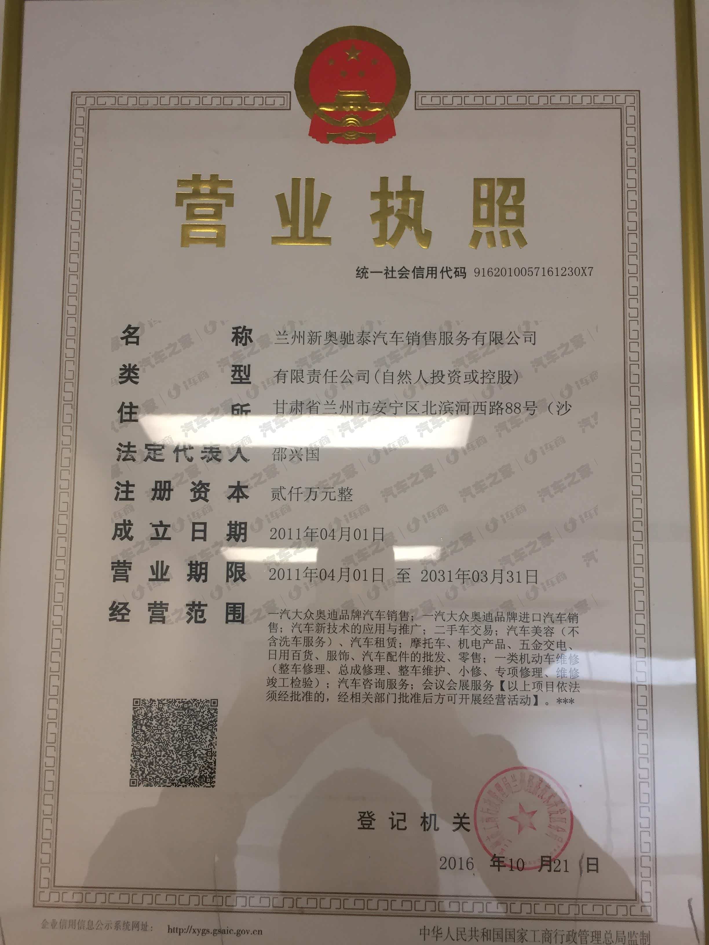 兰州新奥驰泰汽车销售服务有限公司成立于2011年10月,展厅总建筑面积10000㎡,按照奥迪全球统一标准建设,是一汽-奥迪的特许奥迪城市展厅。主营进口奥迪A8L、Q7、Q5、Q3、A7、A5、A4、A3、A1、TT,国产奥迪Q5、Q3、A6L、A4L等奥迪全系列车型,是集品牌体验、车型展示、新车销售和售后服务于一体的销售服务中心。展厅外设有超大停车场,展厅内设有新车展示区,全球同步视听室,健康中心,移动OFFICE系统,金融服务系统等,配套十分完善。维修区有全进口的双杠地藏式R8快修工位、发动机检修工位和铝车身大梁校正工位,可对A8、Q7、TT等采用铝制车身车型进行维修,成套进口专用设备和专用工具为售后维修服务质量做了重要的保障。