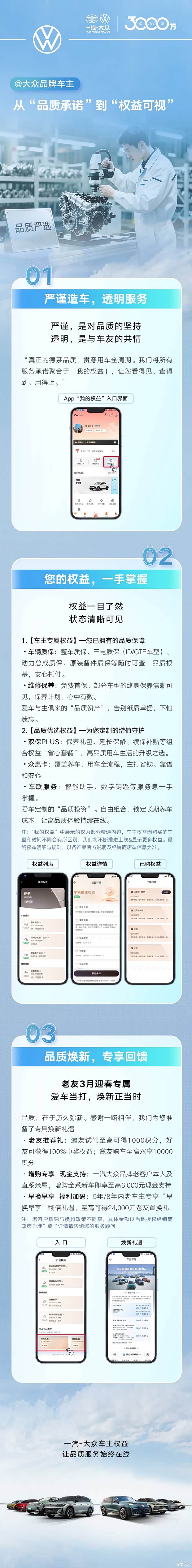 3000 万车主信赖之选,一汽 - 大众将品质承诺转化为可视化权益,让用车保障清晰可查。