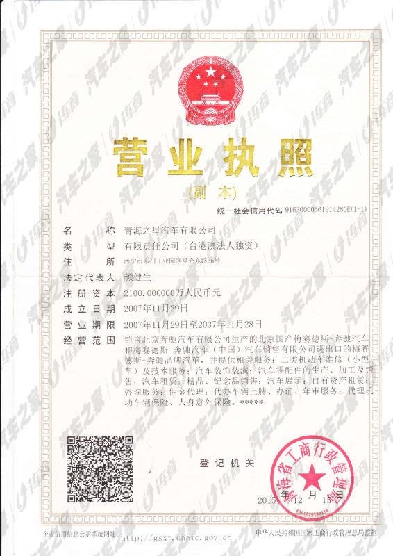 青海之星汽车有限公司,是由香港中星集团投资建设,由利星行管理公司北京公司统一管理,是一家专门从事梅赛德斯-奔驰汽车销售与服务的公司。迄今为止建店已有3年, 早在2007年11月,由西宁市商务局批准,成为中华人民共和国港/澳/台/侨在青海的投资企业。在2008 年5 月,又经青海省商务厅与青海省工商局批准,并获得梅赛德斯-奔驰(中国)有限公司和北京奔驰汽车有限公司共同的授权,成为梅赛德斯-奔驰品牌汽车青海省唯一授权经销商。 公司在利星行集团的直接管理和指导下,力求将其建设成为能够统一开展整车,及零部件的销售、服务、培训、维修等各项综合服务的销售公司,为客户呢提供更加专业、优质、高效的服务。当然,也是目前青海省汽车行业单一品牌中投资额最大的国际化标准4S店。