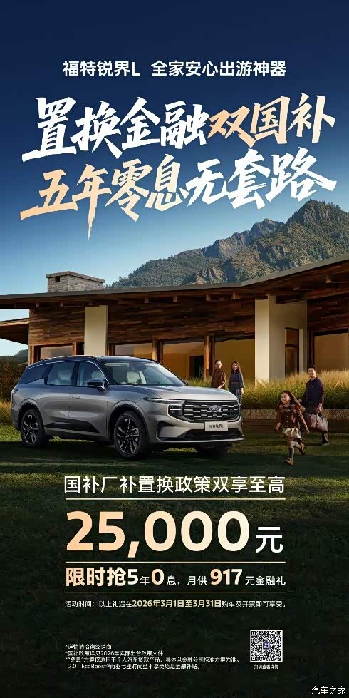 时间不等人,政策更不等人。眼下正值3月下旬,福特锐界L推出的“五年0息”金融方案依然在火热进行中,折算下来日供仅需30元,月付低至917元。这是什么概念?相当于每月少下两顿馆子,就能把一台能装下三代同堂的大七座SUV开回家。