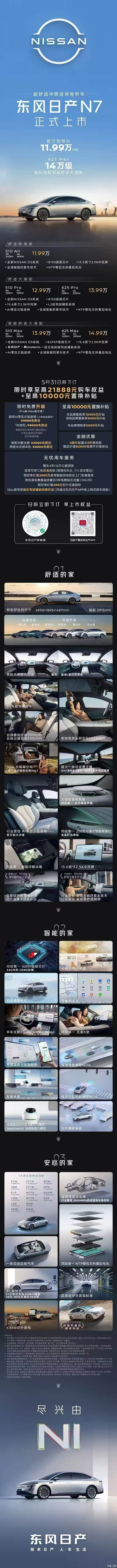 东风日产N7作为品牌面向新能源市场的战略车型,已于2025年4月27日在广州正式上市,售价11.99-14.99万,置换补贴至高5000元,保客置换补贴至高10000元,现在下订享限时权益5000元抵7000元现车试驾车已就位欢迎到店品鉴。