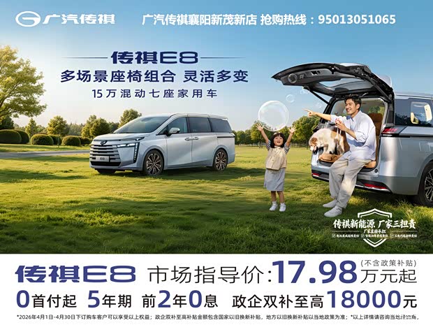 买广汽传祺,就到襄阳新茂新4S店,车源足、优惠多、服务优、口碑棒!幸福进阶颜值升级,中国Jia用车zui优选,全新智电舒享大平、七座组合空间、灵动多变舒适设计、领先1代的广汽星灵架构、720°全方位安全堡垒 !家有E8 双倍幸福—— E8 荣耀专享置换补贴8000元,0首付起,5年期,前2年0息