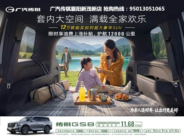 买广汽传祺,就到襄阳新茂新4S店,车源足、优惠多、服务优、口碑棒!17.28万元!传祺GS8大五座四驱版上市!偶尔小野,天地大有不同,2.0TGDI+8AT超级动控组合,400N.m同级 大扭矩,博格华纳,六代四驱,钜星底盘:韧.顺.稳;放肆小野,空间大有想象车身长度4980mm,同级 长轴距2920mm;二排还有女皇躺椅等,小野一下,大享礼遇! 传祺GS8,置换补贴至高13000元,0首付起,5年期,前2年0息
