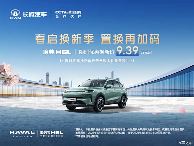 春分将至,万物复苏。对于许多家庭而言,一辆能承载全家出行需求、让旅途更舒适的SUV,正是开启春日旅程的“最佳搭档”。近日,哈弗H6L限时购车政策再加码:3月13日至3月31日,限时优惠换新价低至9.39万元起(已包含现金礼14000元及置换礼10000元)。当诚意十足的购车政策,遇上产品力全面进阶的哈弗H6L,一场关于“换新出发”的春日叙事就此展开。