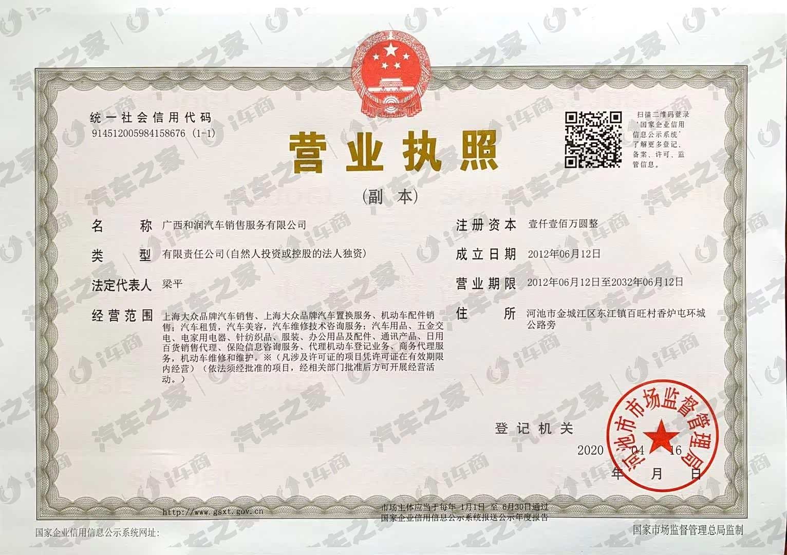 广西和润汽车销售服务有限公司于2014年开业,占地达6000多平方米,是上汽大众汽车在河池市授权的第一家也是唯一一家标准4S店,是集“整车销售、维修服务、配件供应、信息反馈”四位一体的综合性企业,经营途昂、全新途观L、新帕萨特、凌渡、途昂X、新朗逸、途铠、途安L、全新桑塔纳、Polo Plus、辉昂、威然等上汽大众全系列车型。公司严格遵行上汽大众特许经销商最新建设标准,打造极具人性化设计的汽车展厅及维修车间,优雅静谧的星级客户休息区和独特的休闲娱乐区,为顾客营造轻松休闲的购车环境和高质量的售后维修服务。