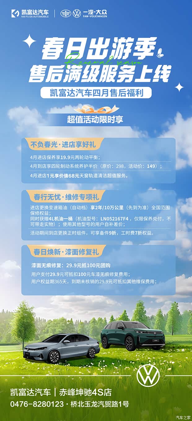 春光正好,出行在即!快带上您的爱车,来赤峰坤驰一汽 - 大众 4S 店(桥北玉龙汽贸路 1 号),解锁春日专属售后福利,以最佳状态奔赴美好旅途!
