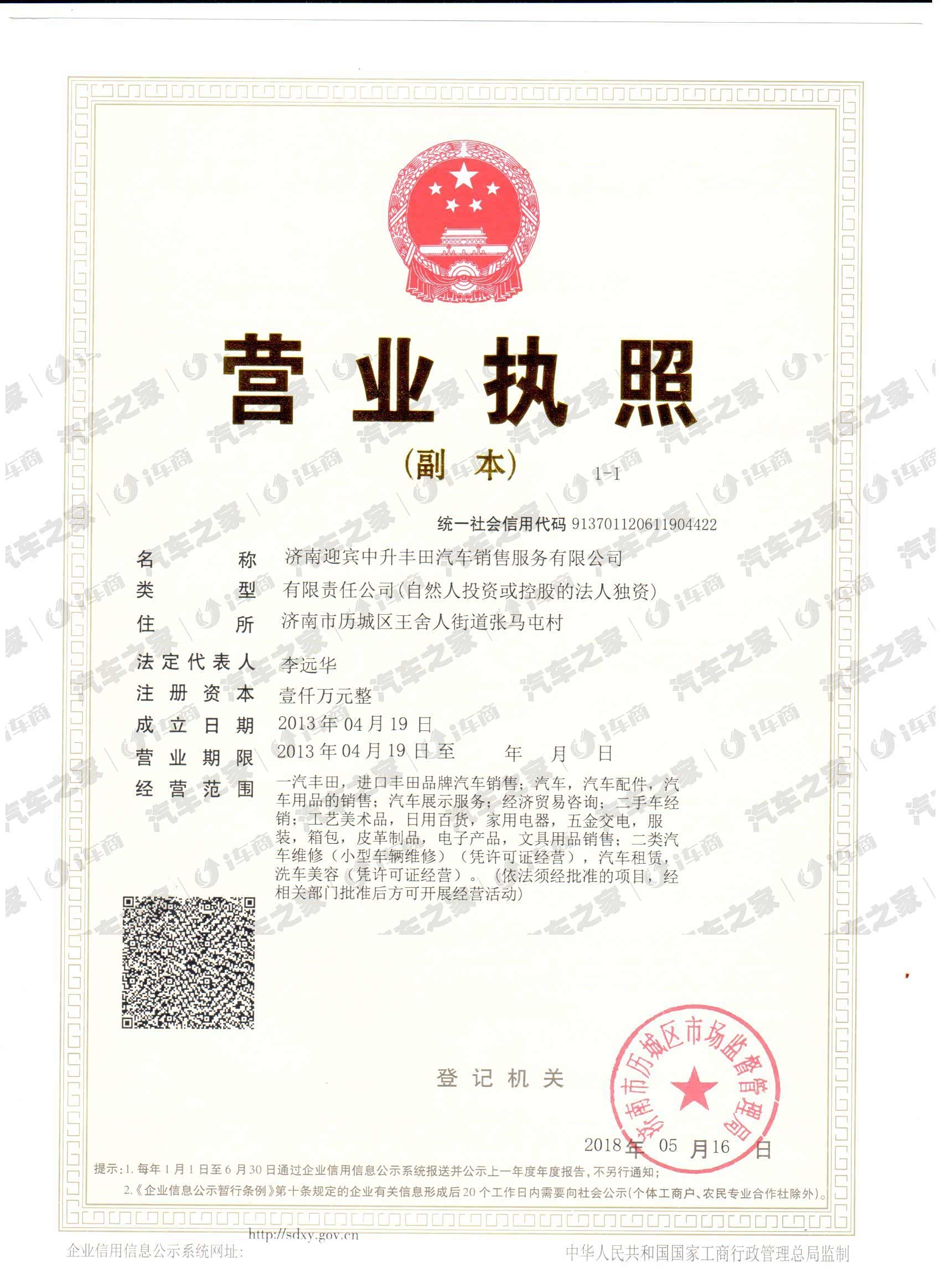 济南迎宾中升丰田隶属【中升集团】旗下子公司,于2014年3月正式营业,集整车展示销售、维修服务、零件供应和二手车评估置换、金融贷款、车辆保险等信息咨询服务为一体的丰田汽车4S中心。