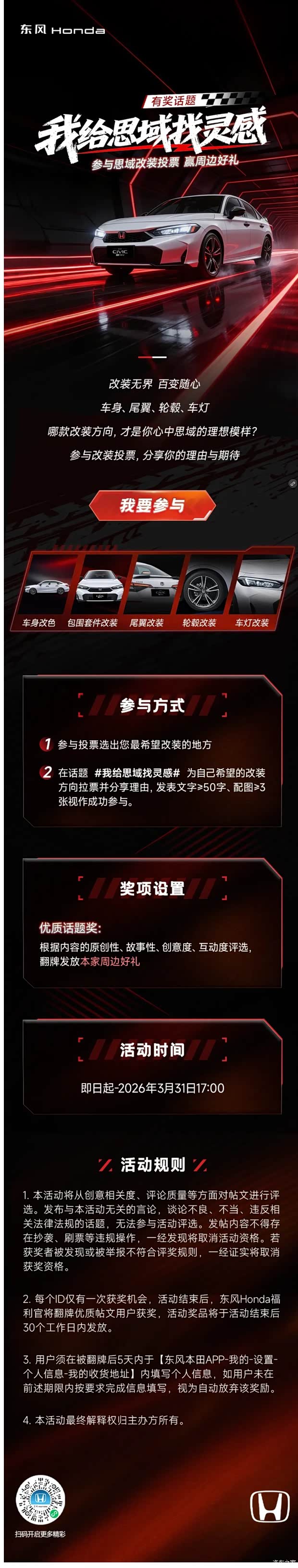 2025 款东风本田思域,以强劲动力、宽适空间、亲民价格,重新定义 A 级轿车标杆。搭载 1.5T 高功率发动机,182 马力 + 240N・m 输出,起步迅猛、超车从容;混动版综合功率 203 马力,兼顾性能与省油。2735mm 超长轴距,后排宽敞不局促,后备箱装载灵活,家用出行皆从容。官方指导价 12.99 万起,终端优惠给力,性价比拉满。动感造型、可靠品质、实用配置,动力够强、空间够大、价格够香,年轻人首选座驾,即刻入手尽享驾趣!