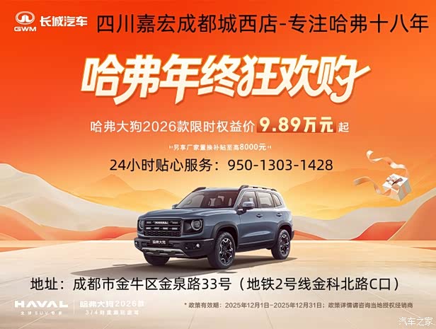 3/4刻度潮玩座驾,哈弗大狗2026款现已焕新上市,潮流方盒子造型更加个性时尚;升级新一代Coffee OS 智能座舱,应用生态更丰富,语音响应更速度;14.6英寸智慧中控屏清晰度更高、操控更流畅;高配车型搭载2.0T+9DCT动力组合,8种驾驶模式,智能电控四驱系统,“2”把锁等配置,越野性能再突破,全场景自由行!现在购车,享限时优惠价9.89万元起,另享厂家置换补贴至高8000元及国补/地补至高15000元等多重壕礼。
