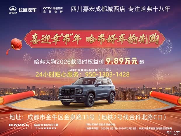 3/4刻度潮玩座驾,哈弗大狗2026款现已焕新上市,潮流方盒子造型更加个性时尚;升级新一代Coffee OS 智能座舱,应用生态更丰富,语音响应更速度;14.6英寸智慧中控屏清晰度更高、操控更流畅;高配车型搭载2.0T+9DCT动力组合,8种驾驶模式,智能电控四驱系统,“2”把锁等配置,越野性能再突破,全场景自由行!现在购车,享限时优惠价9.89万元起,另享厂家置换补贴至高8000元及国补/地补至高15000元等多重壕礼。