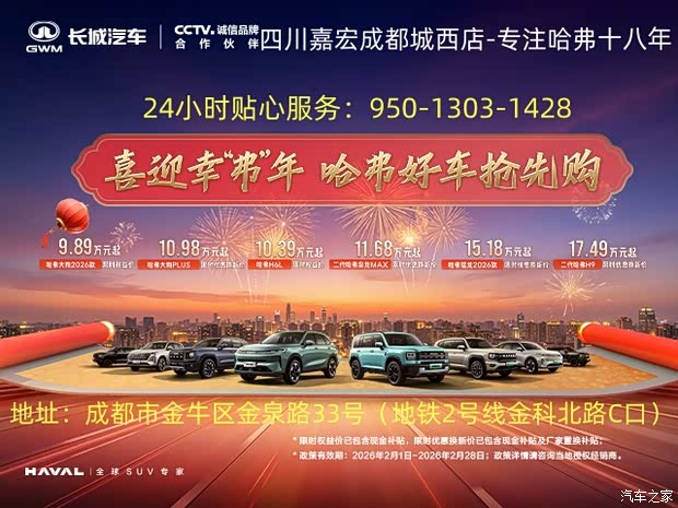 "四川嘉宏成都城西店-专注哈弗十八年,成都官方授权店,专业用心是我们的服务宗旨,累计服务超100万车主。即日起哈弗品牌全系车型联动,限时优惠至高40000元,同时享多重大礼,另享国家和地方补贴政策,性价比超高,欢迎到店赏车!四川嘉宏店为您提供专业的一条龙购车服务!