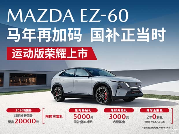 即日起至2026年1月31日,下订购买长安马自达EZ-60/运动版车型,除新国补外还可享限时三重礼!
