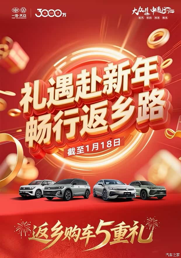年关渐近,开车返乡成为越来越多家庭的出行首选。为满足消费者新春购车需求,一汽-大众重磅推出 “礼遇赴新年 畅行返乡路” 专项购车活动5 重购车好礼及国补厂补双重叠加政策,为用户打造省心省钱的购车体验,活动截止日期为 1 月 18 日。