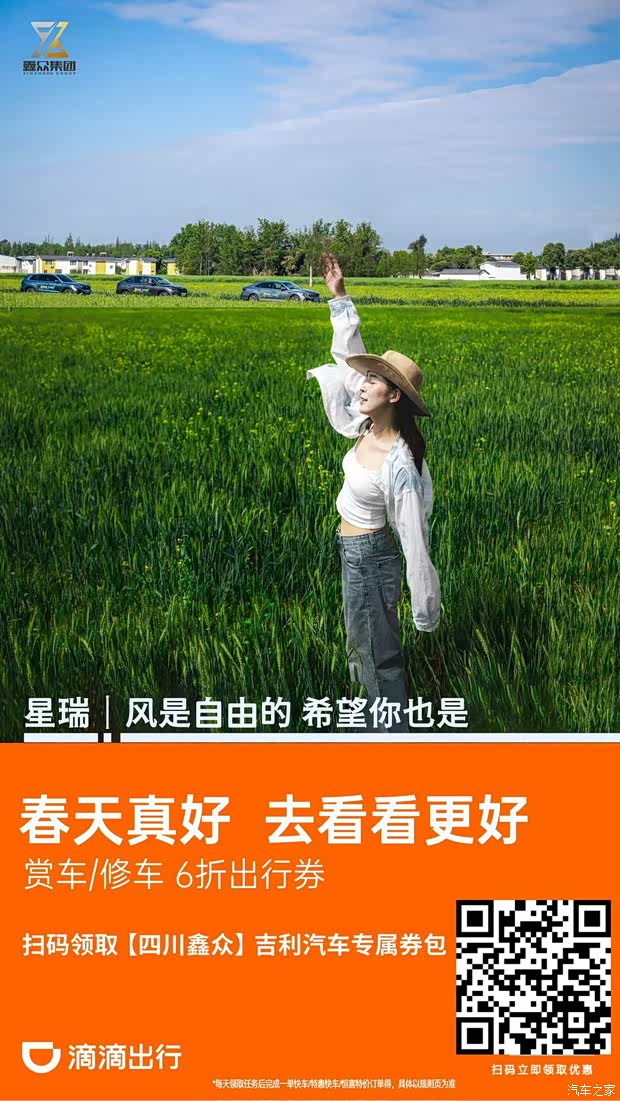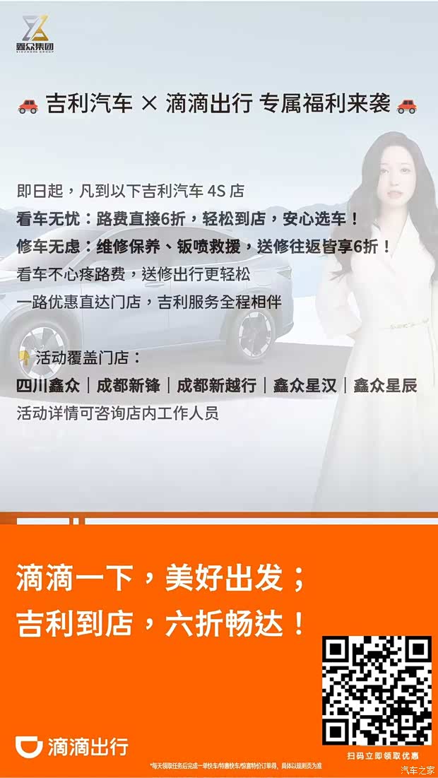 看车、修车路费有着落啦~ 吉利 × 滴滴出行福利! 到店看车修车,滴滴 6 折直达 #鑫众·给你想要的吉利生活