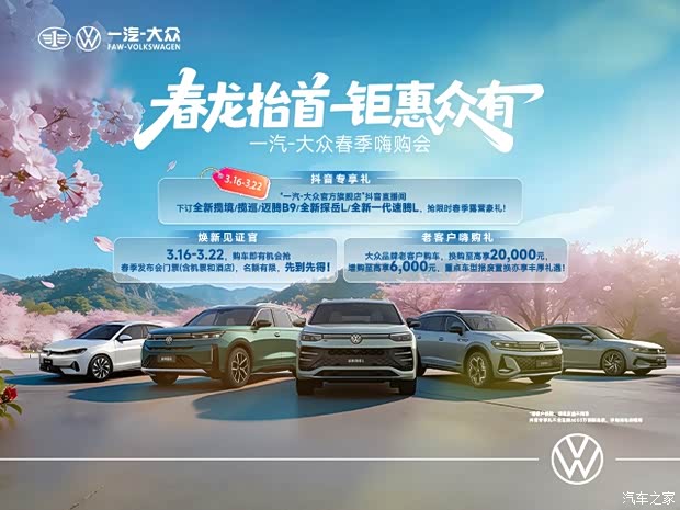 □ 专享礼|锁定一汽-大众官方旗舰店”直播间,下订全新揽境/揽巡/迈腾B9/全新探岳L/全新一代速腾L,抢限时春季露营豪礼!