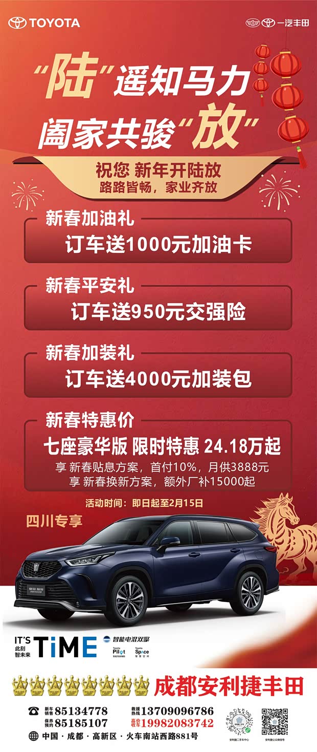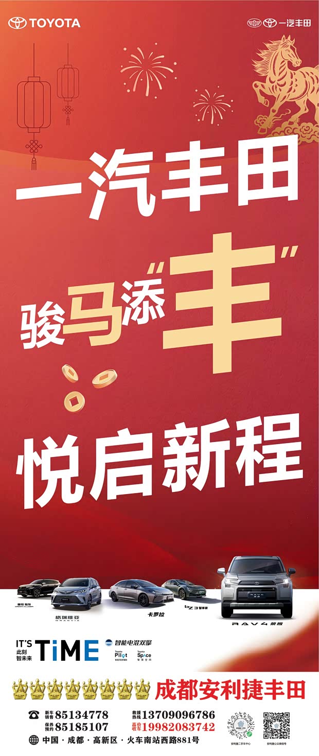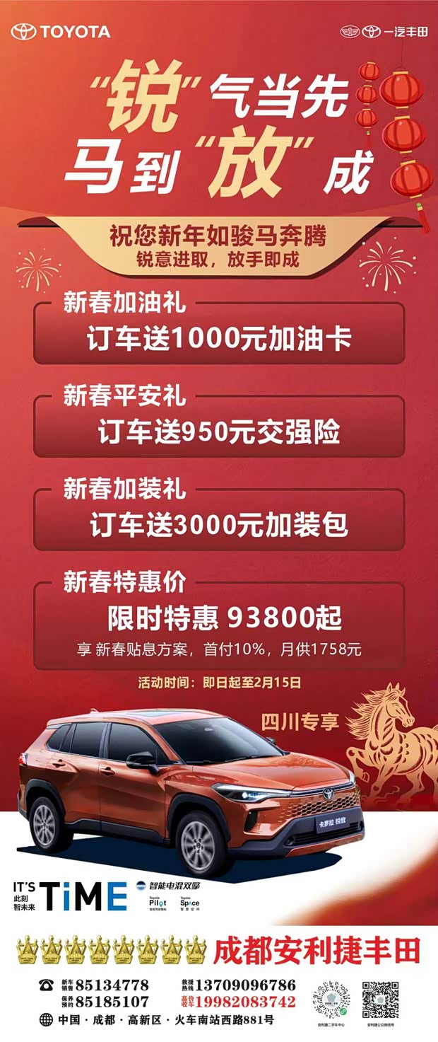 一汽丰田 “骏马添‘丰’ 悦启新程” 四川专场活动已正式开启,即日起至 2 月 15 日,订车即享三重硬核好礼,这波羊毛必须薅住!
