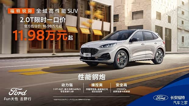 别再为砍价烦恼,福特锐际直接给你一口价!福特锐际开启超值特惠限时一口价购车活动,活动涵盖全系5款车型,仅需11.98万起,即可享受到2.0T+8AT的超强性能,体验超能更超值的全域高性能SUV。