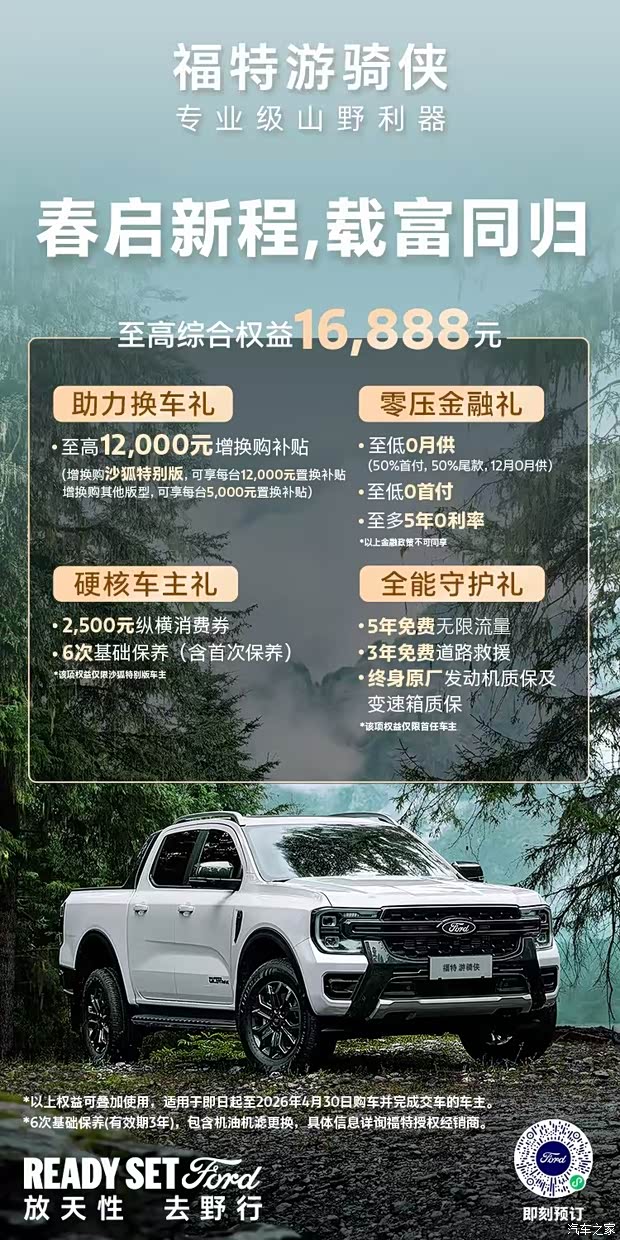 清明过后,无论是归家返程还是携家出游,安全始终是第一位。即日起至2026年4月30日,福特游骑侠Ranger「春启新程,载富同归」限时购车礼遇火热进行中,至高综合权益16,888元,让这台“专业级山野利器”为全家出行保驾护航
