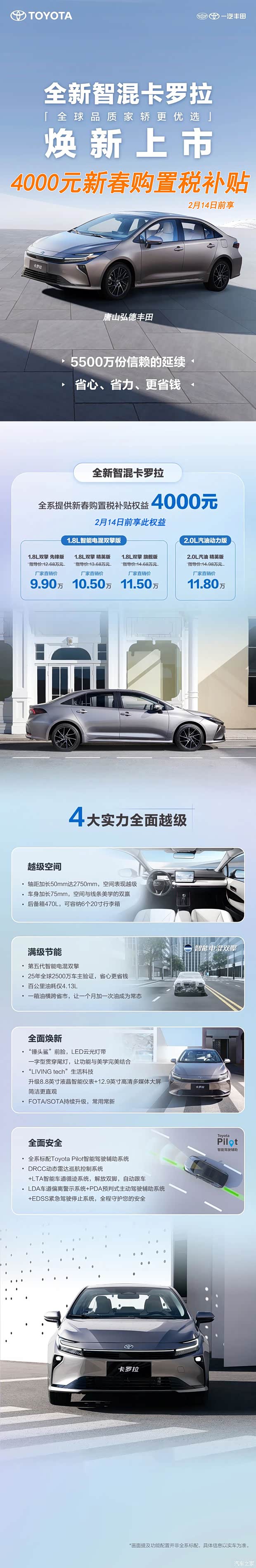 2月14日前购买双擎及2.0L版卡罗拉享新春购置税补贴4000元