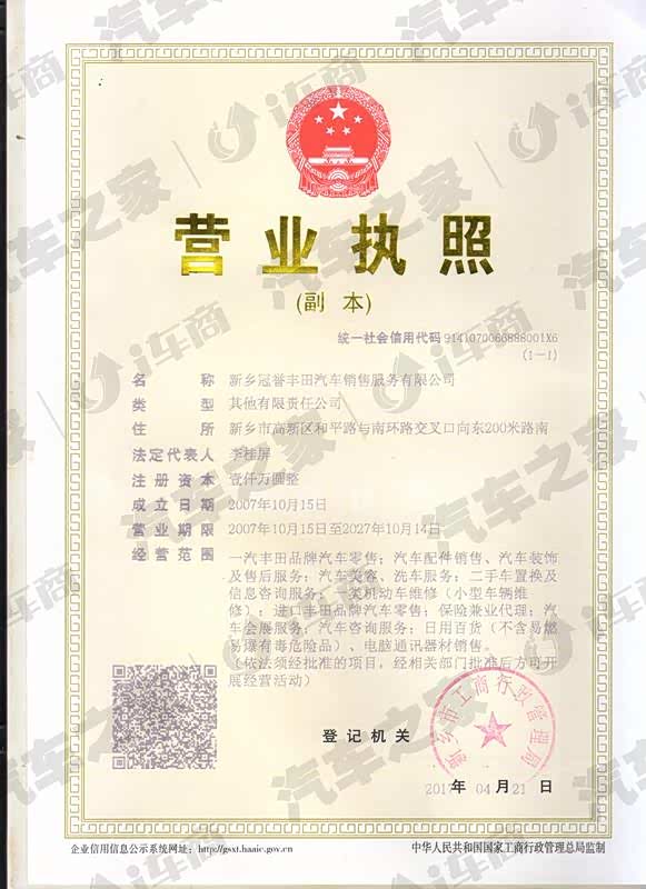 新乡冠誉丰田汽车销售服务有限公司由长久集团投资,一汽丰田授权认证的4S品牌经销店,公司注册资金1000万,占地4500多平方米,建筑面积5100平方米,528平方米的展厅气势恢宏,1675平方米的维修车间宽敞明亮,先进的检修设备,现代化的办公环境,优雅的客户休息区、卡通式儿童娱乐室,体现了客户至上的人文关怀。