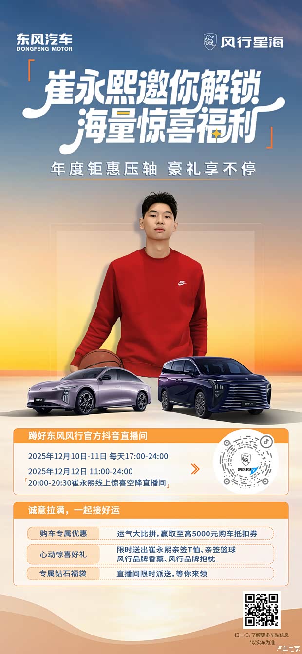 双十二作为年终消费收官的关键节点,用户“年终焕新购车”需求持续升温。为破解用户怕买贵、怕错过福利、怕挑选麻烦的购车顾虑,东风风行以“惠聚风行双十二 年终豪礼享不停”为主题,重磅开启双十二购车直播,携手星海代言人崔永熙,以明星联动、场景解读、超值福利三重buff 加持,助力消费者轻松实现购车焕新。