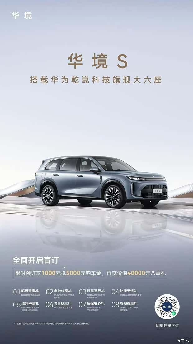 华境S领航科技品鉴会现场,新车正式开启全国预订。用户可通过华为乾崑APP、华境汽车小程序、华境汽车抖音账号等官方通道下订。限时下订可享受 1000 元抵 5000 元购车金,更可叠加价值40000元的八重专属礼遇。伴随产品发布,华境S首批 158 家体验中心已整装待发,强势覆盖全国 131城,更多门店正持续点亮,以专业、贴心、高效的服务全程陪伴。