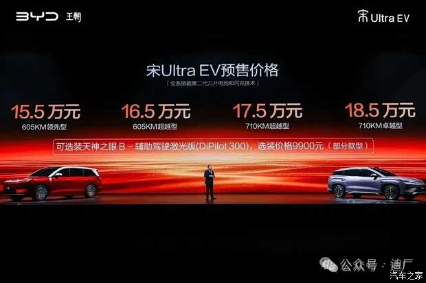 3 月 5 日,比亚迪宋Ultra EV正式开启预售,新车定位B级纯电SUV,搭载了比亚迪第二代刀片电池+闪充技术,710km的超长纯电续航也能做到5分钟充好,可选装天神之眼B-辅助驾驶激光版,预售价15.5万,现在预订即可享受18个月免费闪充权益元起,预计3月26日正式上市。