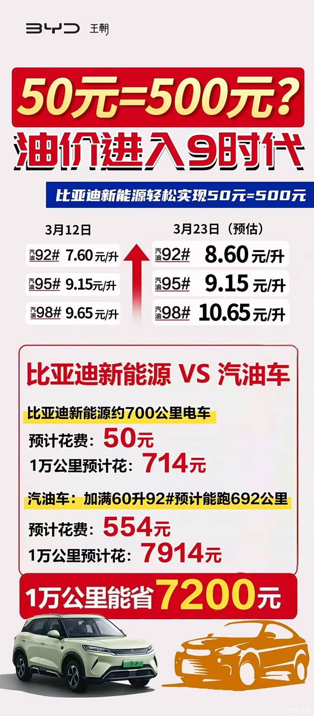 油价上涨,比亚迪新能源1万公里省出7200元,电比油省!