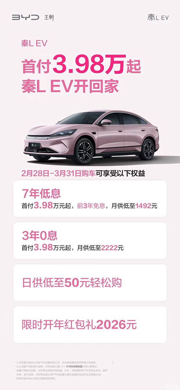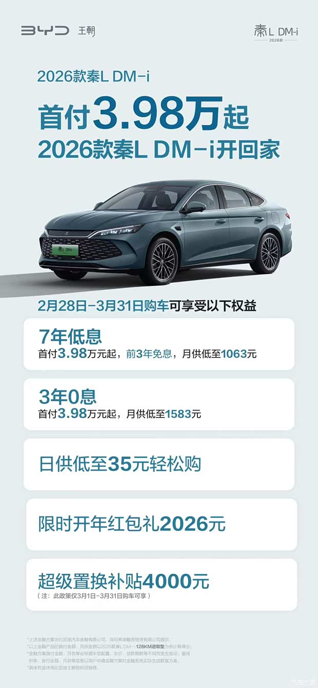 首付3.98万起工业奇迹秦L开回家 #秦L史上zui强金融来袭3年0息、7年低息、日供低至35元 购车即享2026元开年红包礼 秦L DM-i更有超级置换补贴4000元!