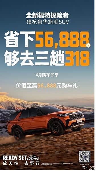 别急,现在就是入手福特探险者的最佳时机!作为公认的“公路之王”,探险者这次不玩虚的,直接甩出一波“王炸”福利:购车即享价值至高56,888元购车礼!省下的这笔真金白银,足够你加满油箱,带着家人去三趟318川藏线,去看看心中的昆仑。