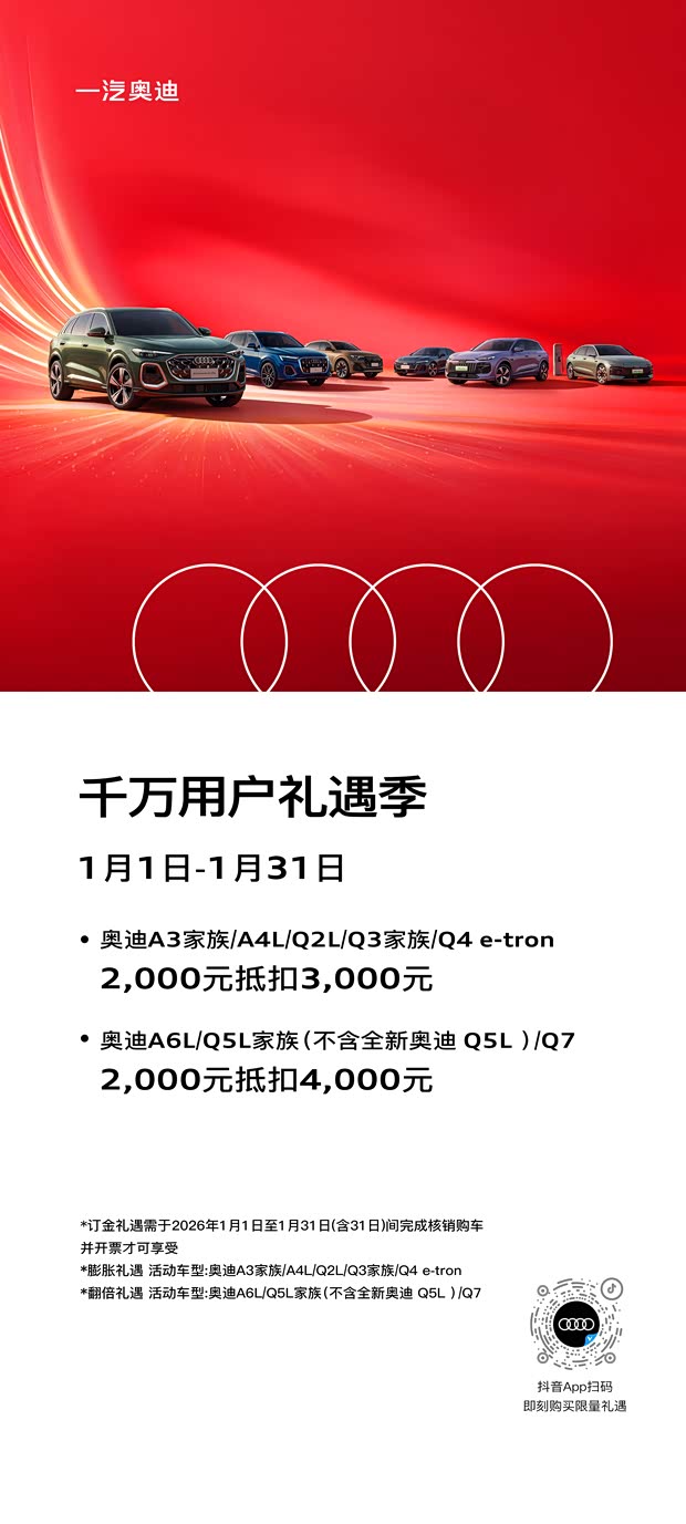 千万用户礼遇季 1月1日-1月31日 奥迪A3家族/A4L/Q2L/Q3家族/Q4 e-tron 2,000元抵扣3,000元 奥迪A6L/Q5L家族(不含全新奥迪Q5L )/Q7 2,000元抵扣4,000元
