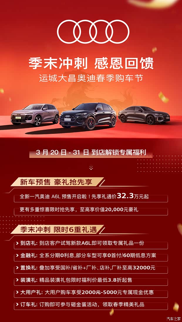 春日渐暖,购车正当时!3月20日-31日,6重专属礼遇,诚意拉满,新款A6L限时权益 抢先购。助力每一位热爱奥迪的朋友轻松解锁豪华出行生活。