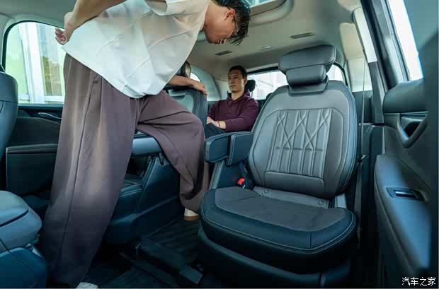 第二排中间200mm的宽敞通道,比很多MPV都宽,直接就能进出第三排,而同级的汉lan达、途angPro等车型,只有2-3-2座椅布局,需要站在车外手动解锁第二排,向前挪动或者掰开座椅靠背,从细小空隙里钻进第三排,姿势狼狈,身体累心更累。