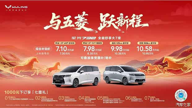 为回馈更多新老用户,五菱还带来新春购车礼遇:即日起,以1000元下订星光730,即可享2000元无门槛超级置换补贴、老用户换购叠加2000元置换补贴、选装电滑门、龙膜太阳膜、三电终身质保、充电桩、多种金融购车方案等七重礼,让「全能舒享大7座」陪伴更多家庭开启舒适团圆年。