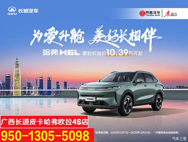 为爱升舱越级而来,哈弗H6L重磅上市,自然律动美学设计天生就美;搭载Coffee OS 3智能座舱,应用生态更丰富,语音响应更速度;14.6英寸智慧中控屏清晰度更高、操控更流畅;高配车型搭载2.0T+9DCT动力组合更省更爽,WLTC百公里油耗仅7.4升,零百加速仅需7.4秒;前车窗静音玻璃,多功能双密度工学座椅。为爱升舱,舒享每一程。现在购车,享限时优惠价10.39万元起。